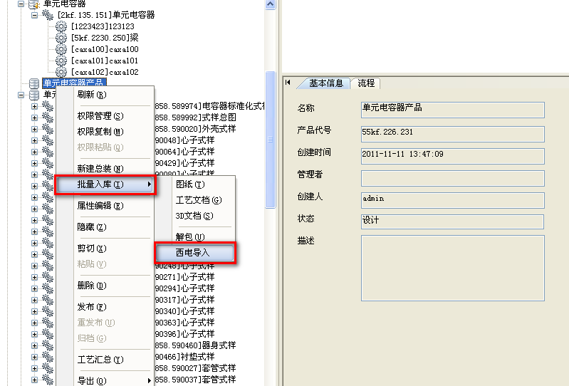 ● 設計完成的四張產品修改單,通過批量入庫方式,導入PDM系統,系統中自動產生產品結構樹