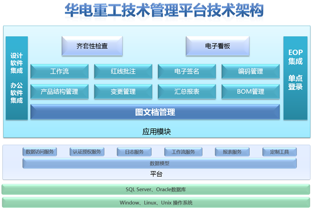 結合華電重工的實際業務需求,CAXA提供了以協同管理為基礎的華電重工技術管理平臺,主要功能模塊包含:設計軟件集成(包括AutoCAD集成、Electrical集成、Inventor集成)、圖文檔、工作流、紅線批注、電子簽名、報表、編碼管理、齊套性檢查、制造看板、EOP集成等模塊,基于功能模塊技術人員可以在平臺中按照工作流程開展工作將技術數據準確、快速的上傳到平臺中,形成有序、高效的管理。再通過單點登錄、EOP集成等,讓技術管理平臺的數據可以為華電重工其它信息化系統傳遞、準確的提供數據支撐。